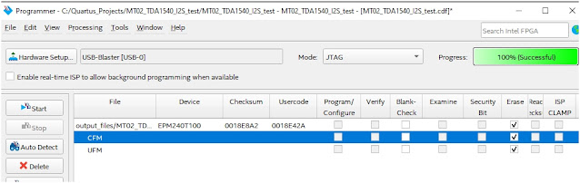 26. For Currently selected hardware: select USB-Blaster and click Close (the picture is from TDA1540, the name will contain PCM and specified bit length)